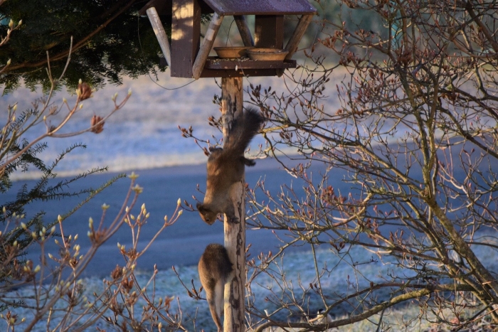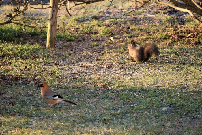 リス2匹、カケス・・朝食会場で時間が重なり、ソーシャルディスタンスで順番待ちです