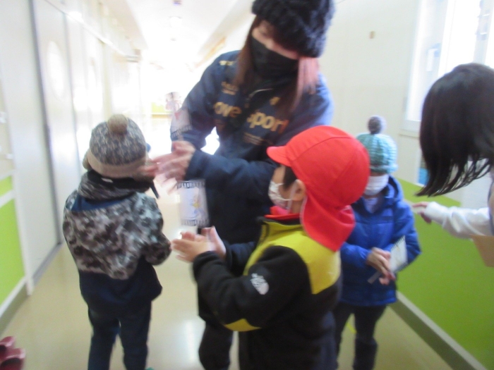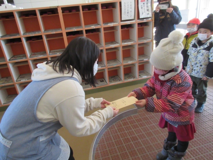 中西別幼稚園のひまわり組のみなさんが、学校を訪ねて来ました。養護教諭の先生に、先日の「正しい姿勢」の保健指導のお礼の手紙を渡しに来たのです。ひまわり組さんは、あと3か月ちょっとで1年生。小学校生活のリズムを作るために、お昼寝をしないで午後も元気に活動しています。