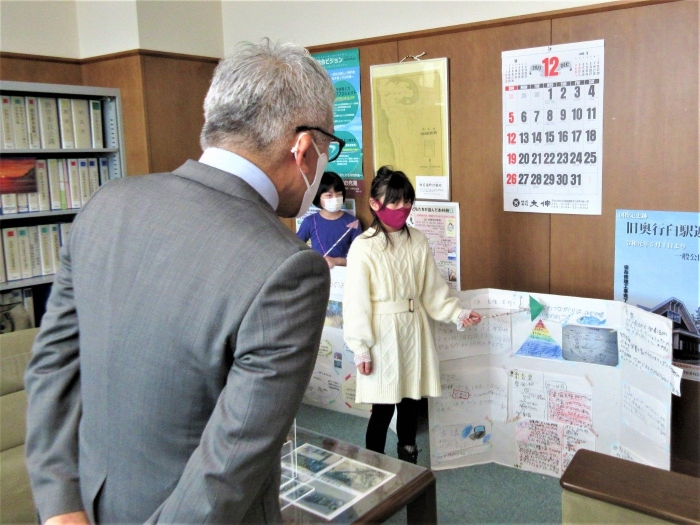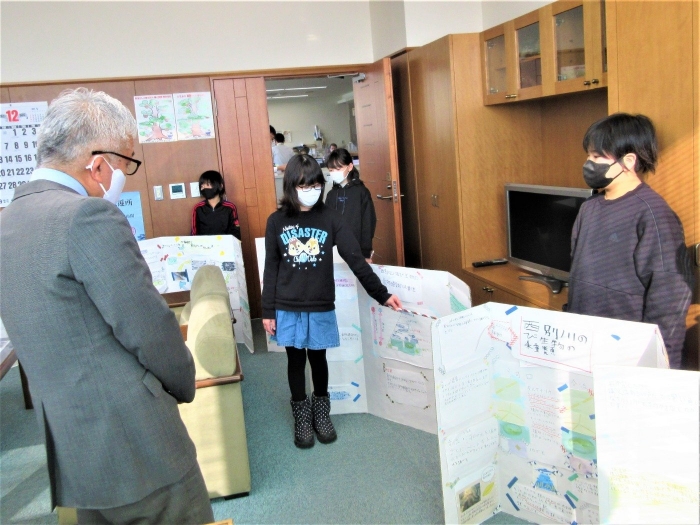 町長さんは、プレゼンボードを抱えた子ども達が話しやすいようにと、広い応接室に通してくださいました。そして、一人一人の研究報告をじっくりていねいに熱心に聞いてくださいました。時々、頷いたり、質問をしたり、感想を話したりしながら、まるで調査研究の協力者のように深く理解をして耳を傾けてくださいました。子ども達はそんな温かい空気に包まれて、自分の考察や研究の結論、これから調べてみたいことなどを一生懸命伝えました。