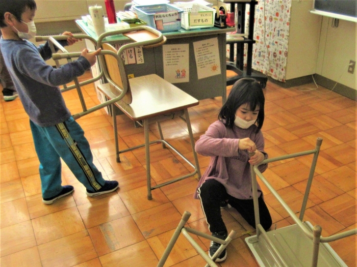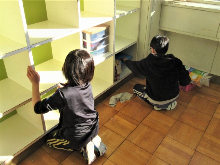 「3人でやったらすぐに終わるね!」抜群のチームワークで大掃除に取り組みます。