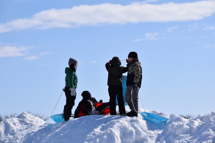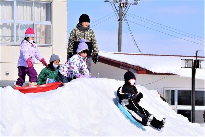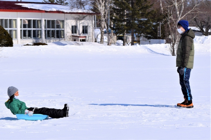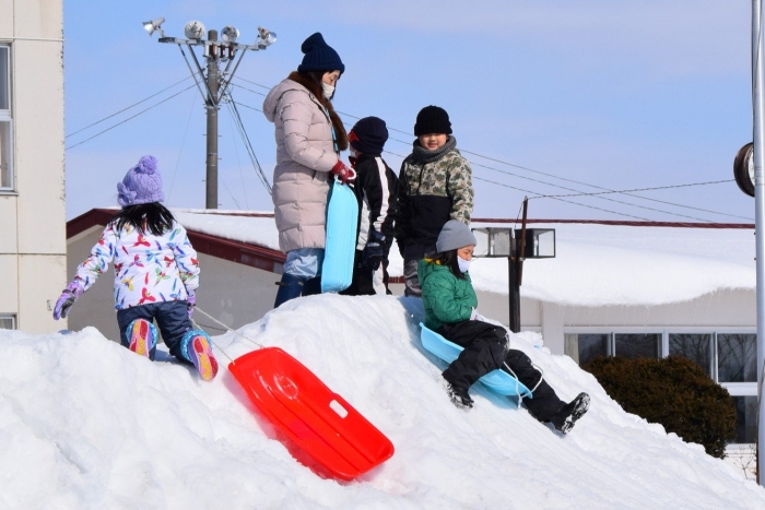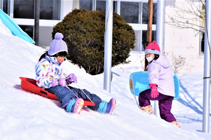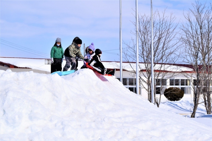 先週の大雪で、グラウンドに新しい雪山ができました。そり遊びにぴったりのわくわくする高さです。公務補さんが安全に遊べるように整えてくれました。早速、そりを持って中西っ子出動!
