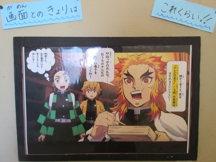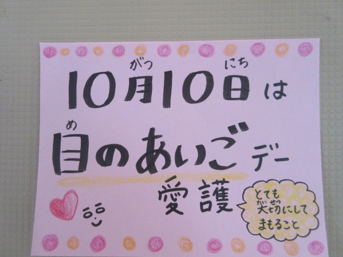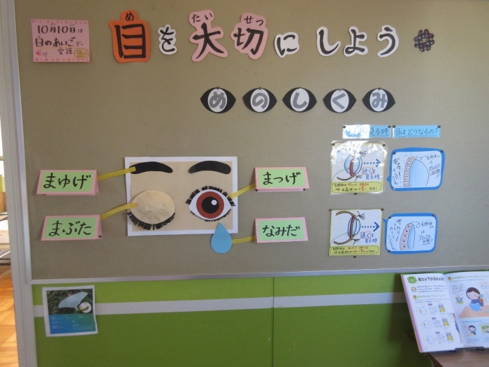 視力・色覚検査を行いました。折しも10月10日は目の愛護デー!養護教諭の先生が校内掲示でお知らせしています。子どもたちの関心もUP!