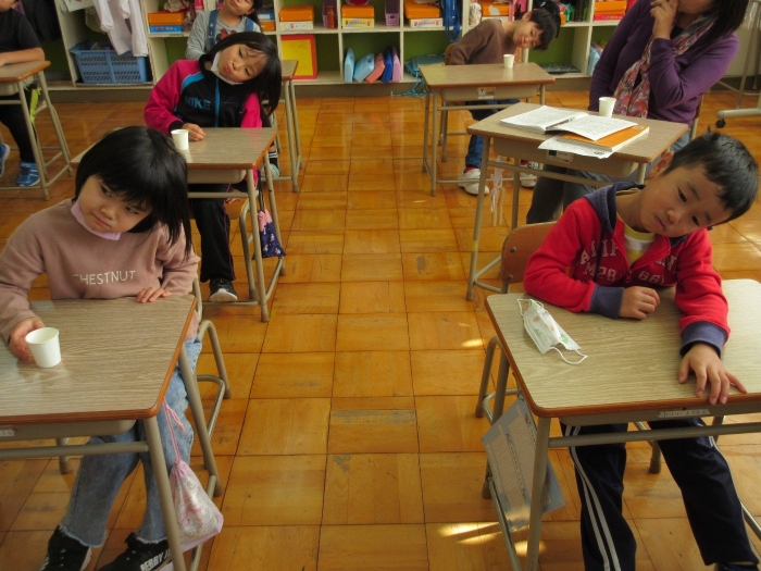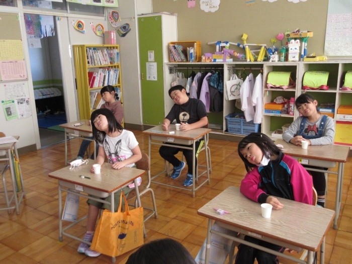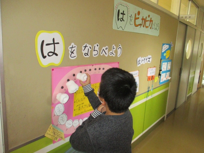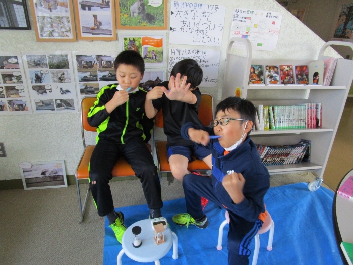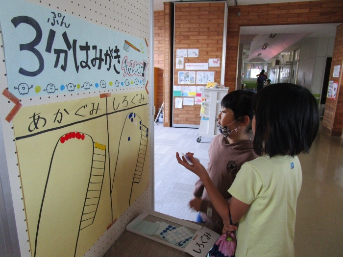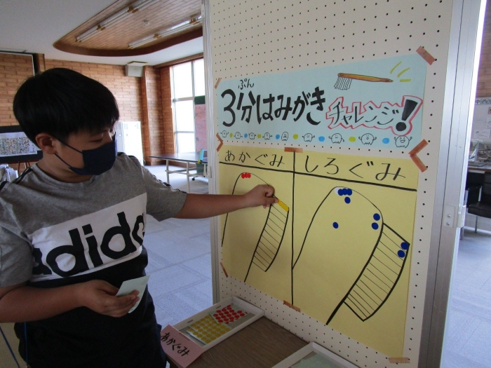 今日から「3分歯みがき紅白対決」がスタートしました。給食の後、砂時計で計測し、3分みがけたらシールを貼ります。赤組、白組に分かれての本気勝負です!