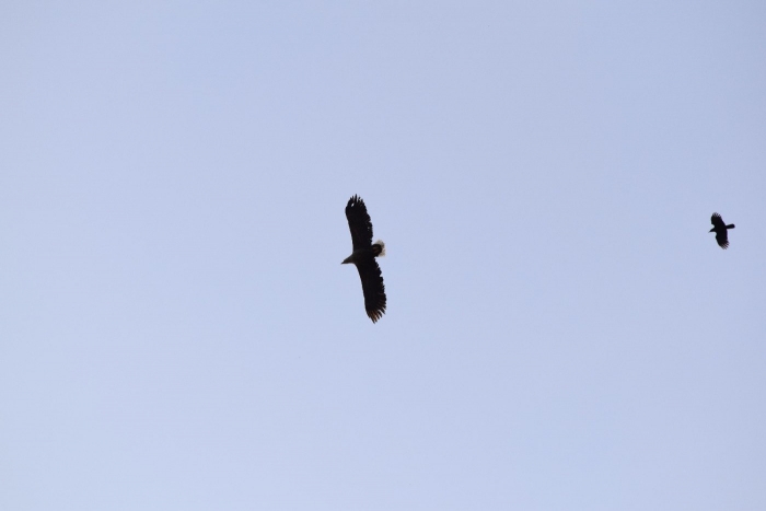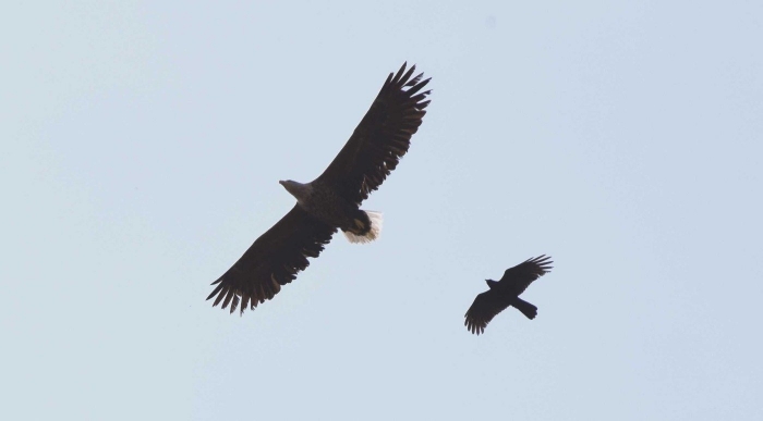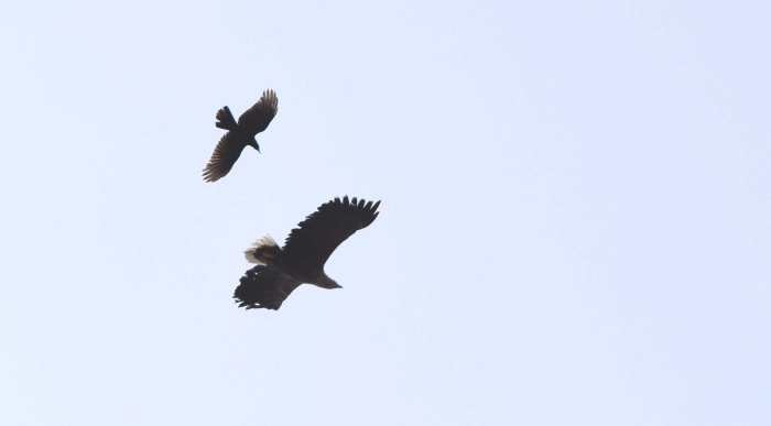 上空には、オジロワシとカラスが追いかけっこをしていました。