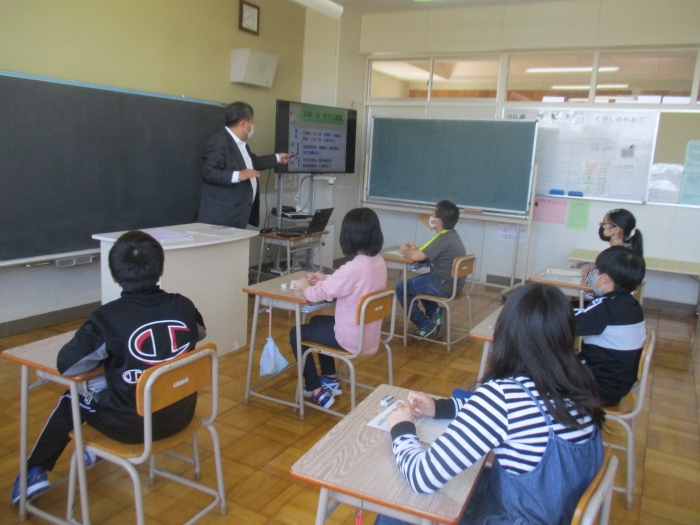 5月11日 租税教室 2022年05月12日(木) 5・6年生が、税について学習しました。税務署の方が講師としてお話してくださいました。 税の種類が約50あること。税の種類によって収める場所が違うこと。集めた税金は公共サービス等で使われていること。などについて学習しました。