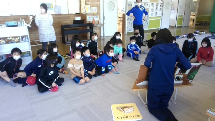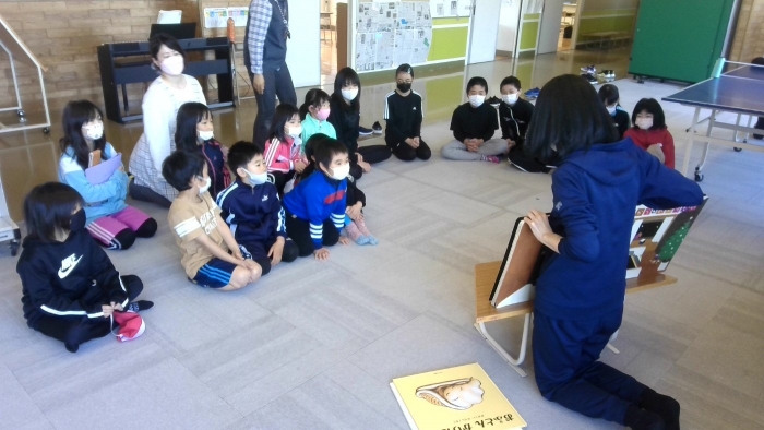 中休みの時間に、2階のホールで絵本の読み聞かせがありました。