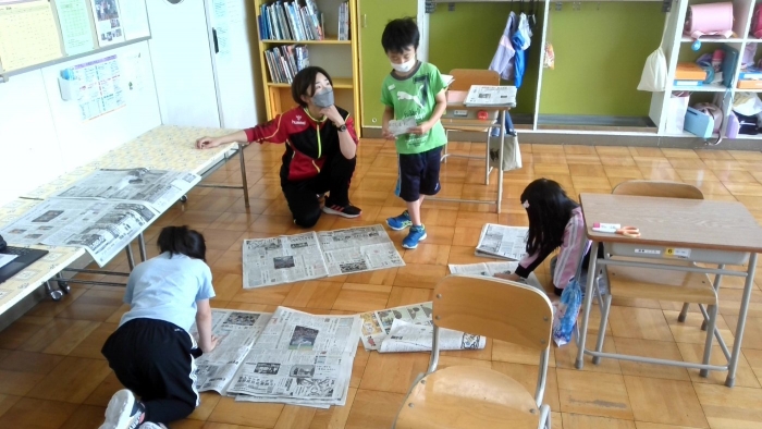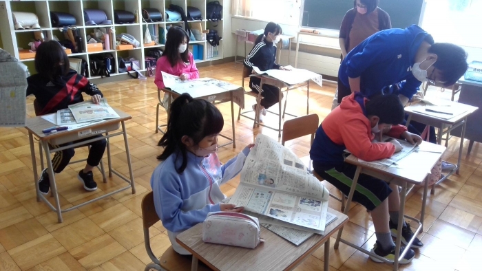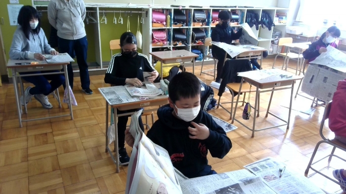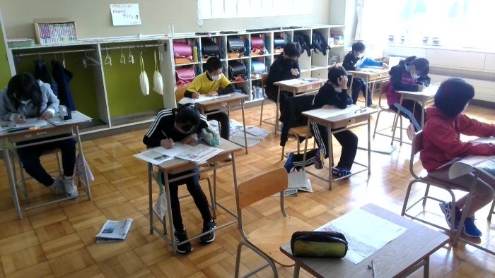 5月30日 NIEの取組 2022年05月30日(月) 朝学習の取組で、全校で新聞を読む活動を行っています。 記事を選んで切り抜き、「見出し」や「要約文」「感想」など、学年に応じて取り組んでいます。 この日も、最近話題の記事や、地域の自然に関する情報、スポーツ欄など、各自が気になった記事を選んでまとめていました。