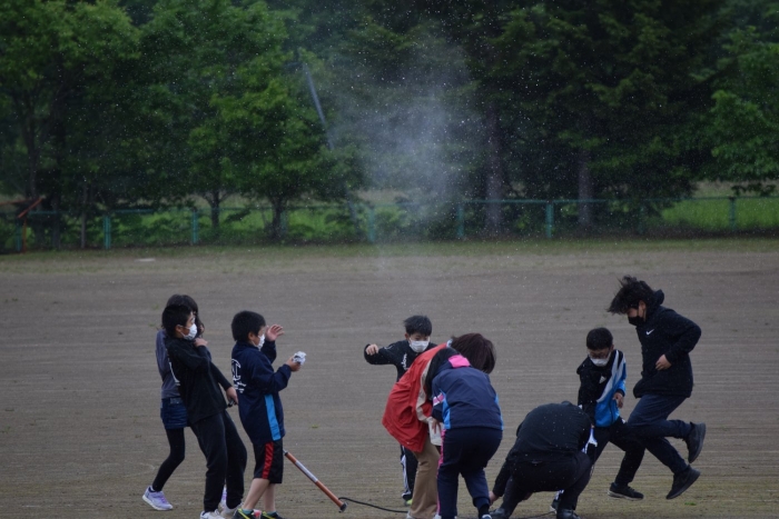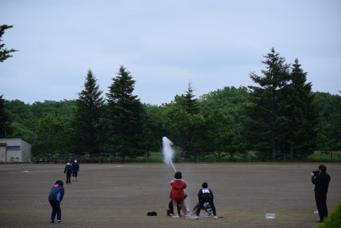 科学実験クラブは、ペットボトルロケットで活動をしていました、最初はなかなか発射せず悪戦苦闘していましたが、後半は、条件を変えながら何度もロケットを飛ばしていました。
