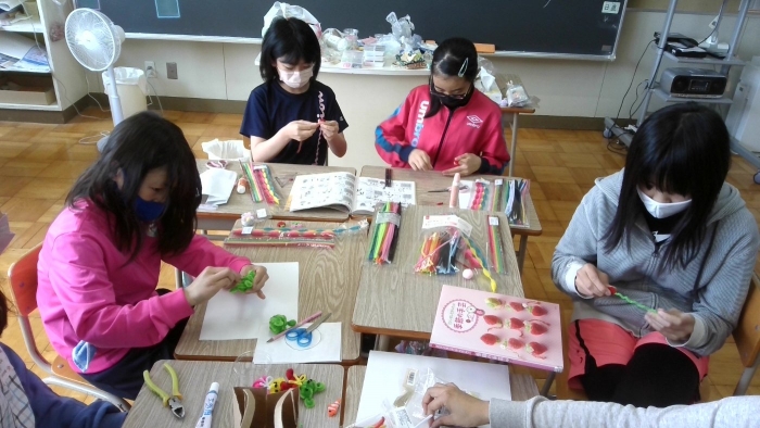 工作イラストクラブは、ペットボトルを使ったペンダントづくりと、モールを使った小物づくりをしていました。