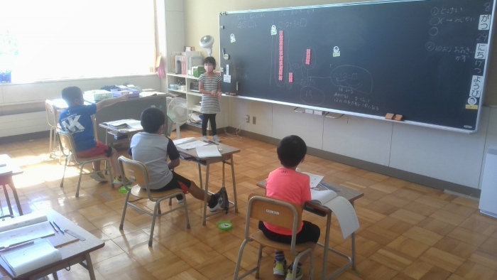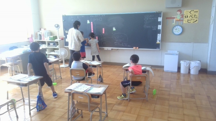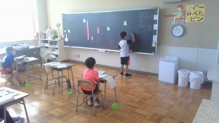 8月29日 考えを伝え合う 2022年08月29日(月) 1年生が算数の時間に、計算の仕方について一生懸命説明していました。 図やおはじきを使ったり式を書いたりして、自分が考えたことを伝え合っていました。 「まず」や「~すると」などの言葉を使って、計算の順序をわかりやすく説明しているのに感心しました。 相手にわかるように説明するのはとても難しいことですが、学習を通して着実に成長しています。