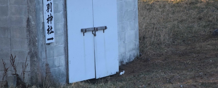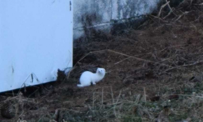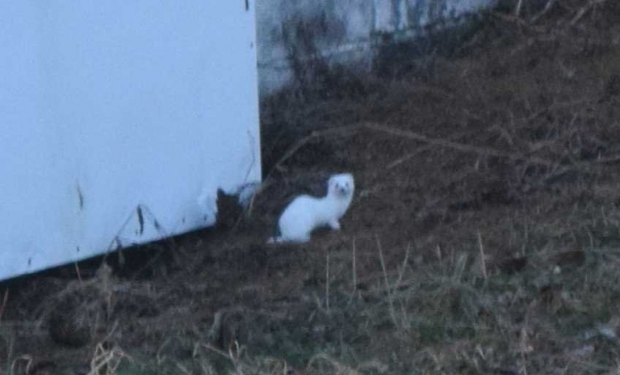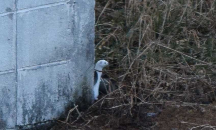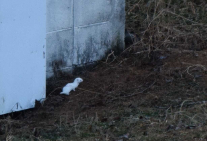 建物の近くに白いものが動いています。よくみると「おこじょ」でした。