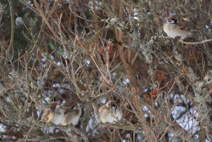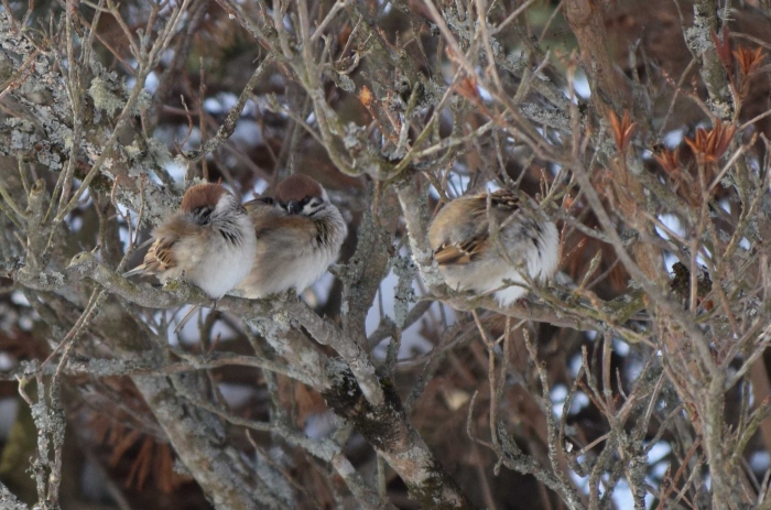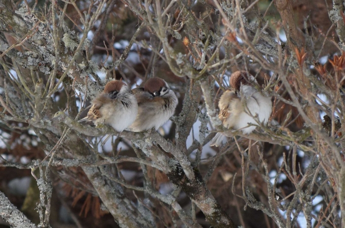 スズメも体を寄せ合って耐えていました。(眠ってる?)