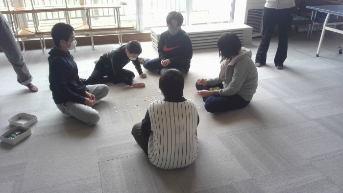 お楽しみ会の一コマ。おはじきやカルタを楽しむ高学年。