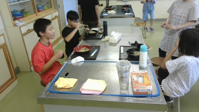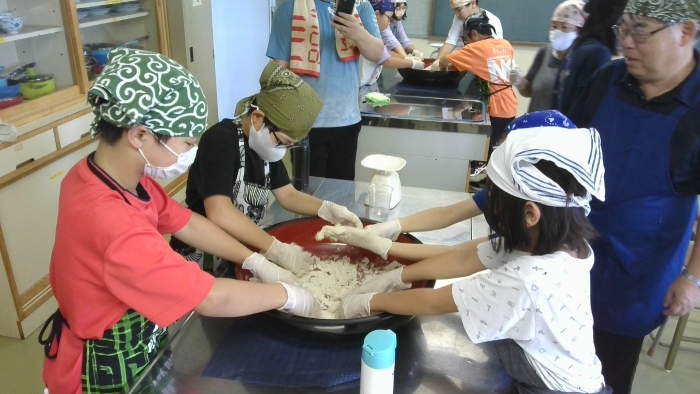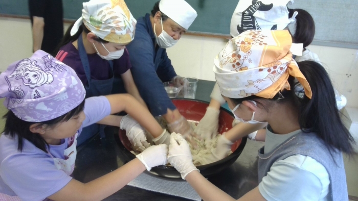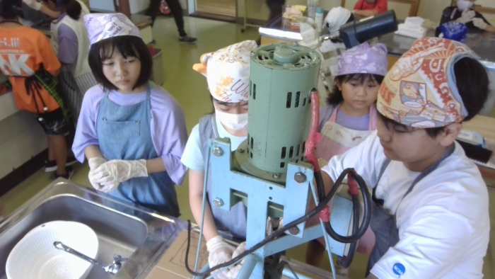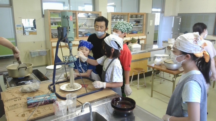 8月31日 そば打ち体験 2023年08月31日(木) クラブの時間にそば打ち体験をしました。 練って、丸めて、製麺機で麺を絞り出すやり方を体験しました。 昔は、各家庭でそばを栽培して、日常的に食べていたそうです。 今回は、昔の生活に触れる機会となりました。 最後は、出来上がったそばを、みんなで美味しくいただきました。