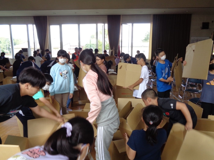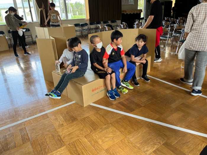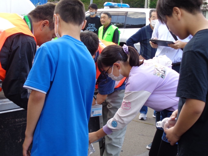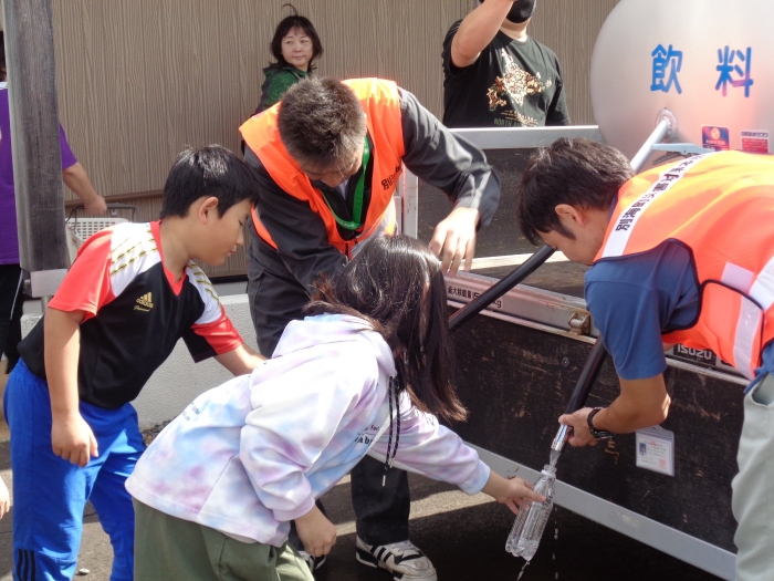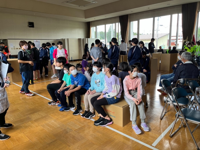 ふれあいセンターに避難し、給水車による給水や段ボールベットづくりを体験しました。