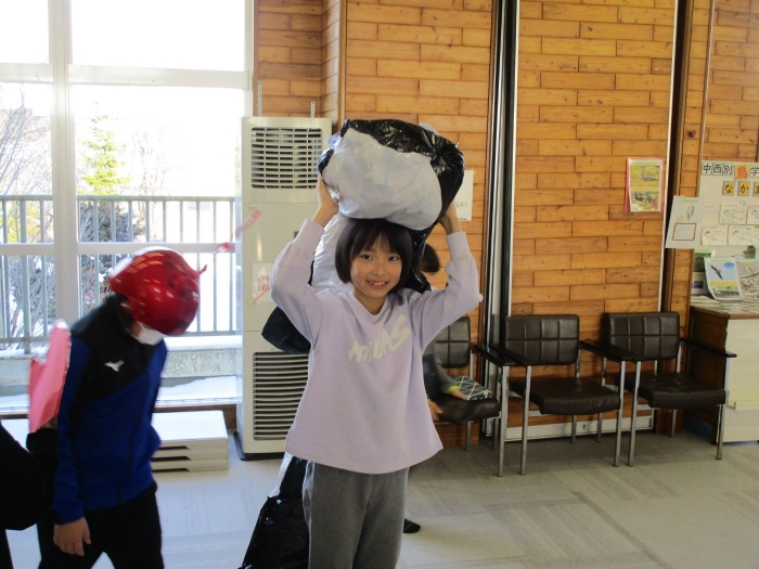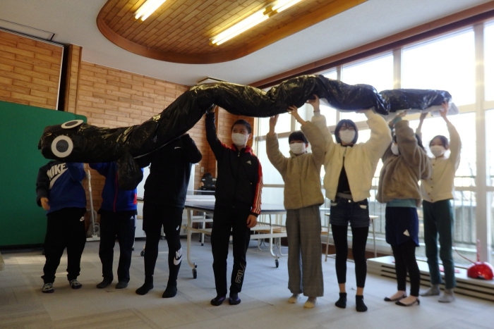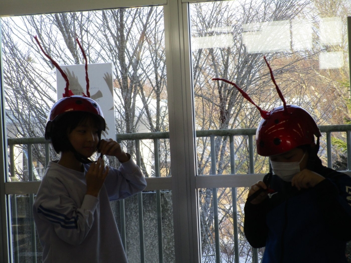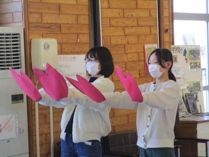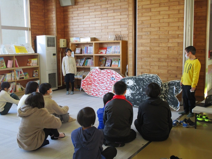 2年生の国語の学習を活かして、スイミーを劇にしました。その時に作った道具や写真で、取組の様子を、みんなに伝えました。