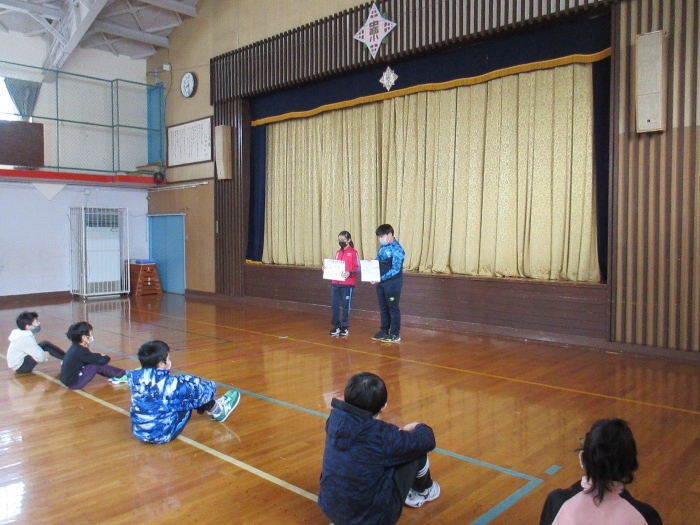全校朝会で、5・6年生が話し合って決めた3学期の目標を、全校児童に発表しました。