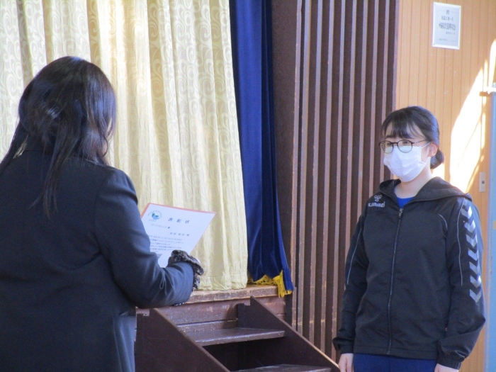 全校朝会では、感染症対策のため全校朝会がずっとできなかった表彰を行うことができました。