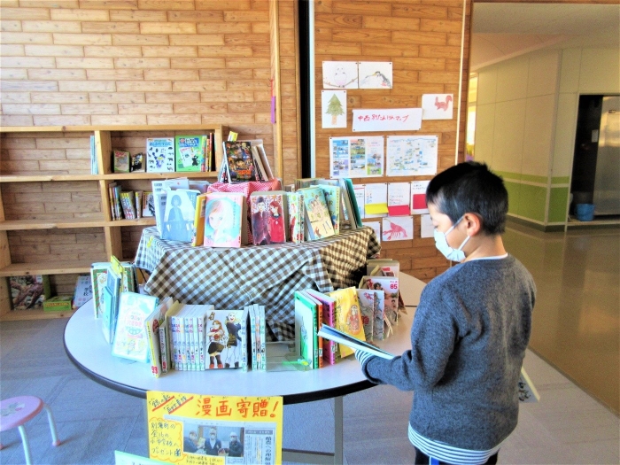 5・6年生が全校に呼びかけてプレゼンした「本をたくさん読もう」の第1弾です。一番投票数が多かった「漫画からはじめよう」の企画が始動したのです。寄贈図書やビブリオバトル本、新着図書等で、酪農をモチーフにしたり、体内の細胞をモチーフにした興味深い漫画がそろっています。2階ホールですれ違うと、「これ読んだ?」「おもしろいよ・・」「家にもあるんだよ・・」など、本の話題で言葉が交わされます。学校にお越しの際は、本コーナーもどうぞご覧ください。