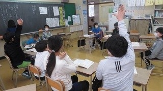 課題(新スポーツ)は、『風船3つドッチボール』。身近なテーマだけあって、一つ意見が出ると、質問、反対、改善意見などが次々と出されます。司会者がしっかりと指名しながら討論が進んでいき、黒板書記、ノート書記の担当の子どもは手際よくまとめていきます。話しが行き詰まると、実際にやってみて感触も確かめながら話し合いを進めていました。