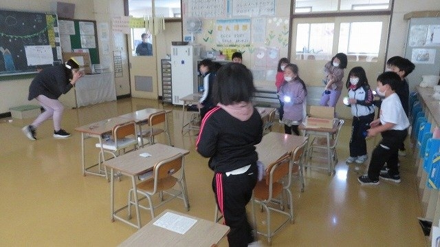 お楽しみ会のクライマックスは、力を合わせて“ぴえん”というキャラクターをやっつけるゲームでした。ぴえんのお面をかぶった担任の先生につかまらないうちに、教室にはられた8枚のカードに光を当て呪文で封印するゲームです。
