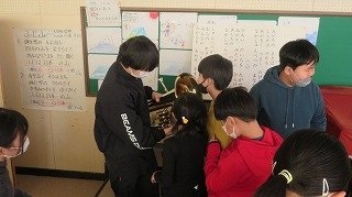 準備室から楽器の入った箱を持ってきては、一つ一つ取り出してみます。教科書の写真と箱の形から楽器の名前を予想して、「トランペットだ!」「トロボーンだ!」だ「ホルンだ!」と口々に声があがります。そして取り出されたピッカピッカの楽器を見て「楽器の表面に顔が映っている!!」など歓声があがります。チューバのかわりはユーフォニウムという楽器でしたが、目の前にあらわれた教科書に載っているとおりの楽器見て、その大きさや形の美しさをリアルに感じることができました。