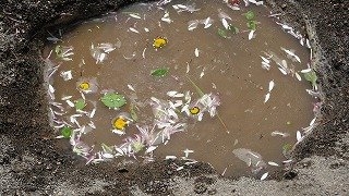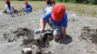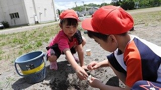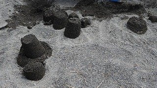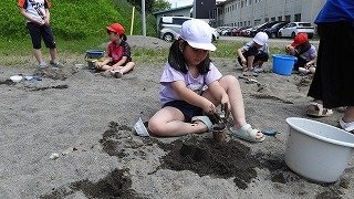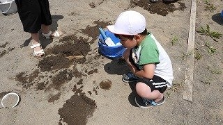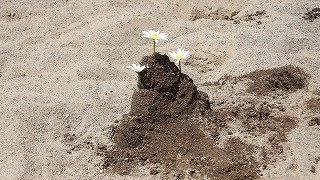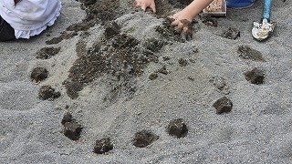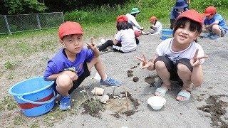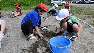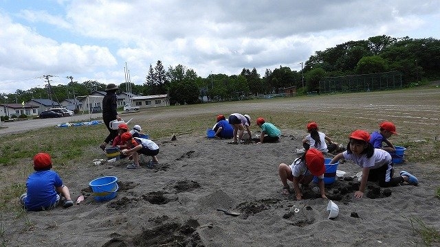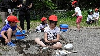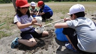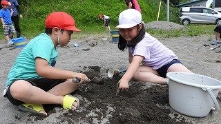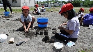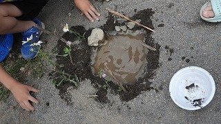 すなとなかよし 2023年06月28日(水) 授業の様子 1年生の図工では、砂場で水と空き容器を利用していろんな形作りに取り組んでいました。 砂場というキャンパスに並んだ作品たちは、まさに子どもたちの想像の形です。近くに咲いている草花や木切れなどをデコレーションして作品を作っていきます。砂の上に出来上がった作品の名前を聴くと、プリンだったり、動物だったり、温泉だったりととってもバラエティー豊かでした。