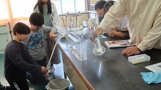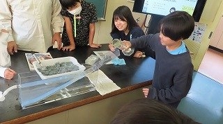 6年生の理科で地層のでき方について考えるための実験観察を行っていました。