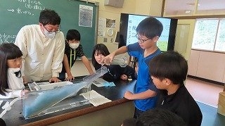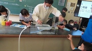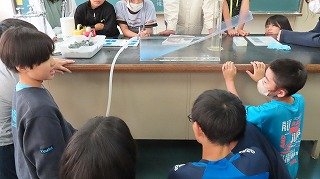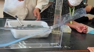 土砂が山から川をつたい海に流れ込む様子を、沿岸をモデルにした実験器具を使って観察していました。実験用のプラスチックケースの中には、色分けされた礫砂泥で造られたしま模様がくっきり。
