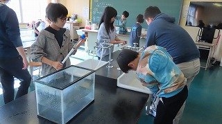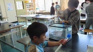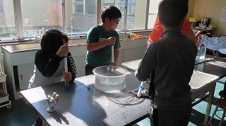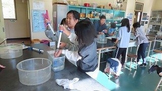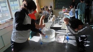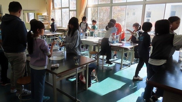 先に学習していた空気の時と比べて、まるで様子が違います。水の量を変えたり、力の入れ具合を変えたりといろいろ条件を変えながら試してみました。中には、水と空気を半々ぐらいに入れて試したりしている子どももいました。