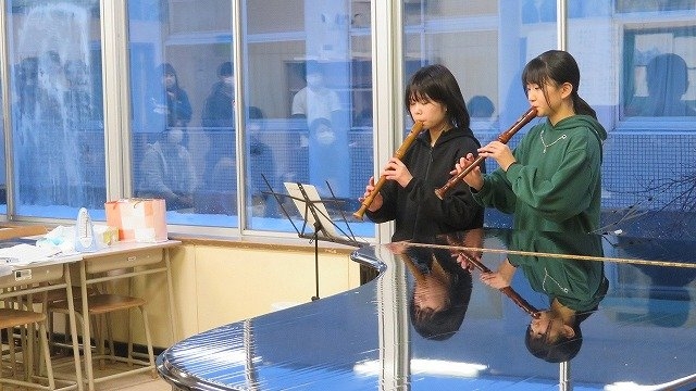 卒業する6年生と5年生が奏でるリコーダーの演奏に新会員の3年生も加わってのミニコンサートです。