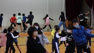 昨日の中休み。全校児童が体育館に集まり、よさこいを踊りました。