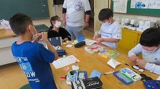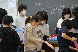 アート・イラストクラブでは、バルーンアートに挑戦です。始める前は風船が割れるのを怖がっている子どももいたようですが、しだいに扱いに慣れ、剣や子犬などを創り上げていました。