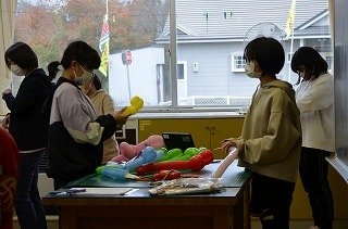 ハンディクラフトクラブは、小物づくりとトーとバックづくりに分かれて制作していました。色とりどりのフェルトを使って思い思いの形を作品にしていました。