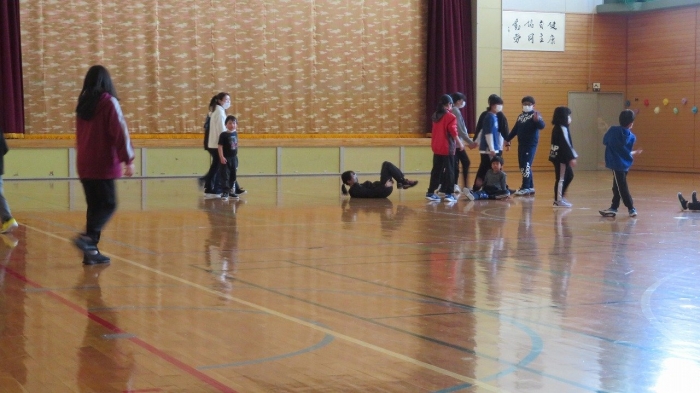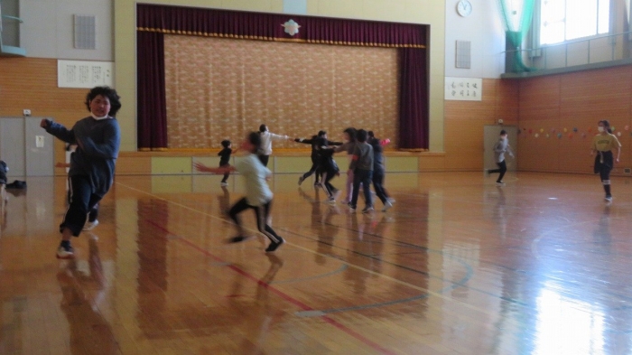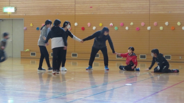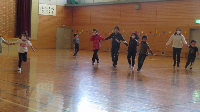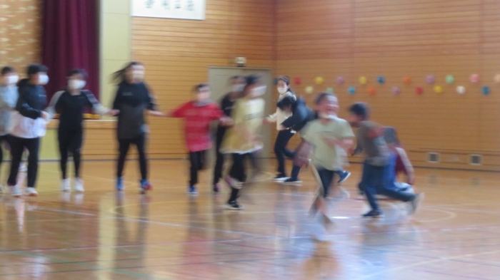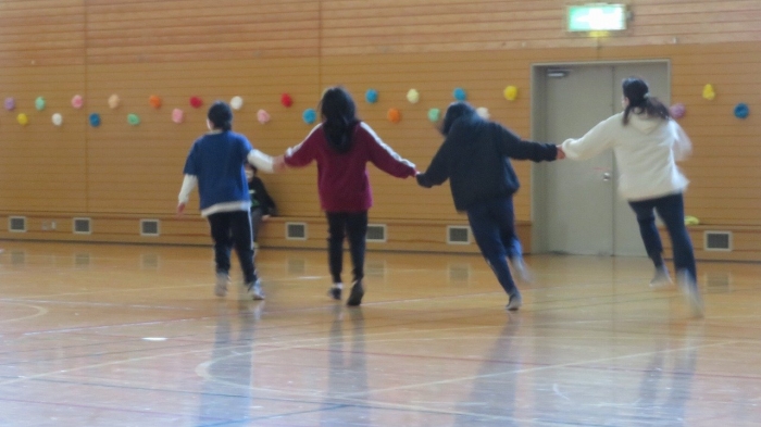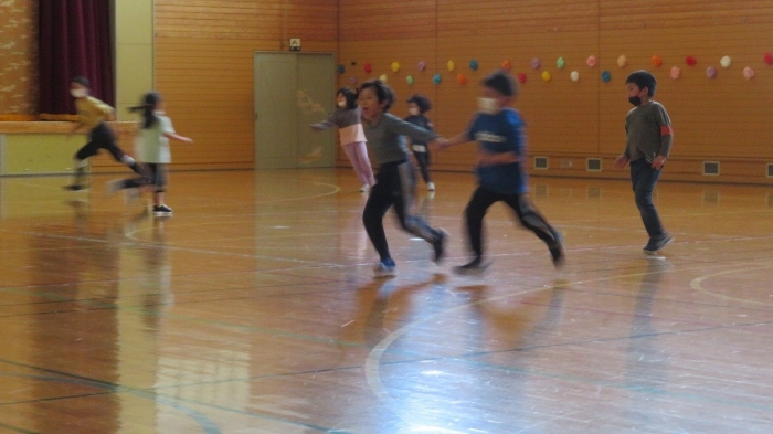 今日の遊びは手つなぎオニ。オニになった人たちが3~4人に分かれて追いかけるというのはよく見かけますが、オニたちが手をつないだままどんどん増えていくバージョンでした。