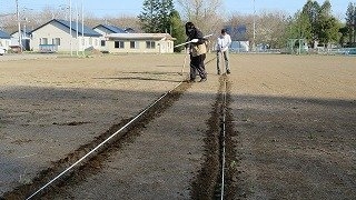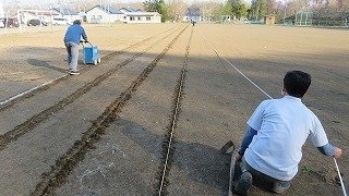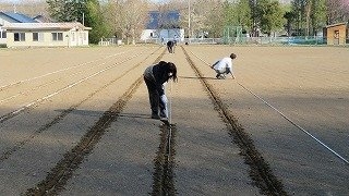 昨日の放課後、運動会に向けて100mコースやトラックのグラウンド設営を行いました。