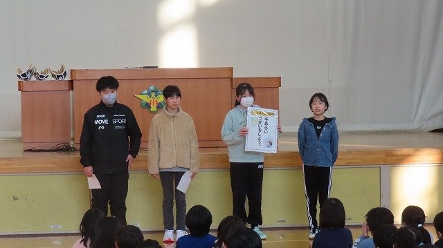 はじめに児童会から今月の目標の発表と防災・防犯をテーマにした5・7・5の募集のお知らせがありました。