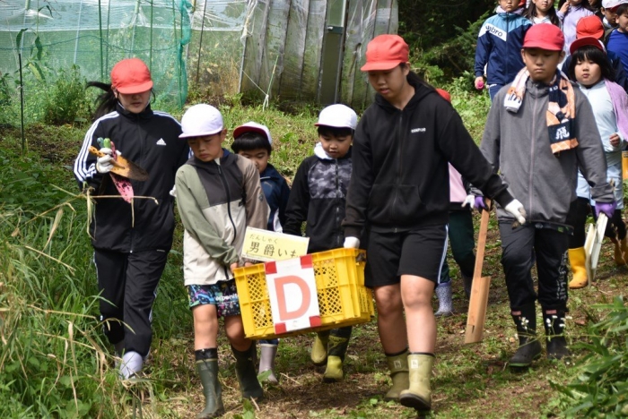 6年生のリーダーシップのもと、楽しそうにイモ掘りをしていました。