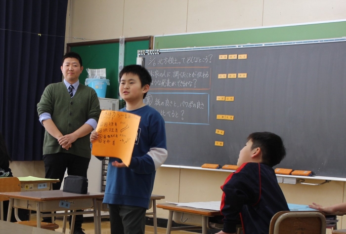 3年生は総合的な学習の時間で、これまで学んできた北方領土について、まとめをリーフレットにしたりクイズ形式にしたりして発表しました。