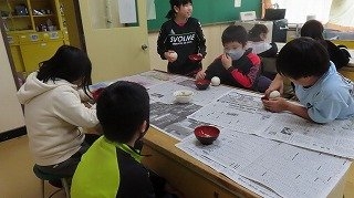 5年生が、バケツで育ていた稲を刈りとり、干して乾燥していた稲穂の脱穀を行いました。
