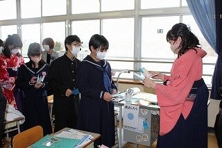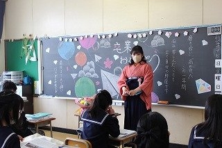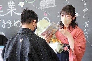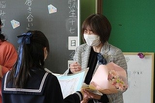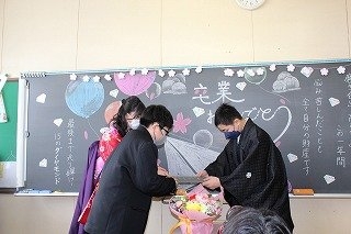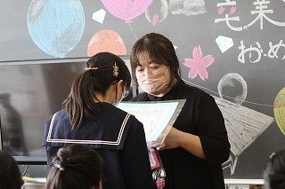 最後の学活では学年団の先生から卒業生へのお祝いの言葉が伝えられ、卒業生からは御礼のメッセージカードが先生方に送られました。