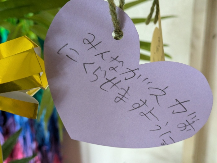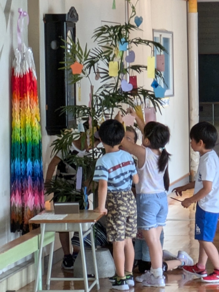 玄関前に笹が設置され、子どもたちは願い事を書いた短冊を付けていましたよ