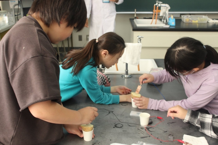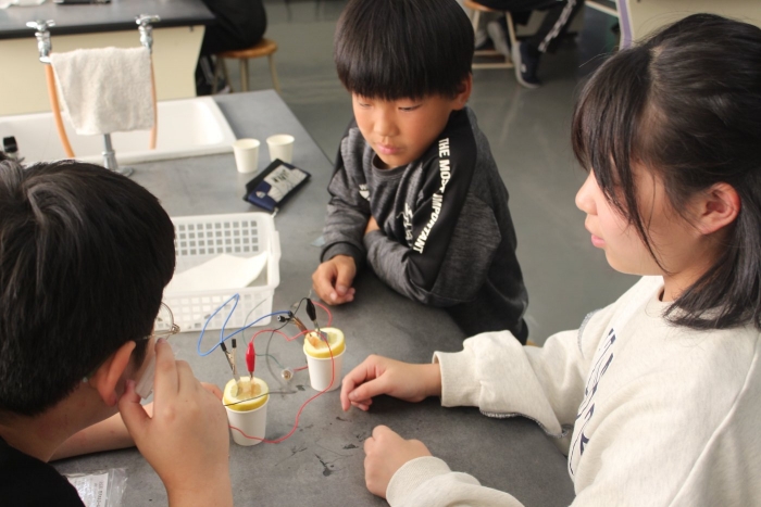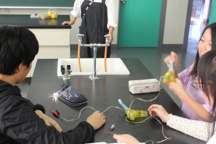 最後に、電極をジャガイモやレモンに刺すことで発電をしオルゴールを鳴らす実験を行いました。なんと、ジャガイモやレモンに刺しても発電ができ、オルゴールが鳴ったのです!!