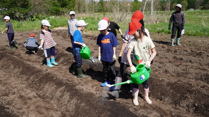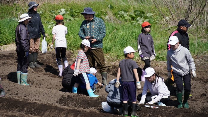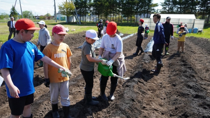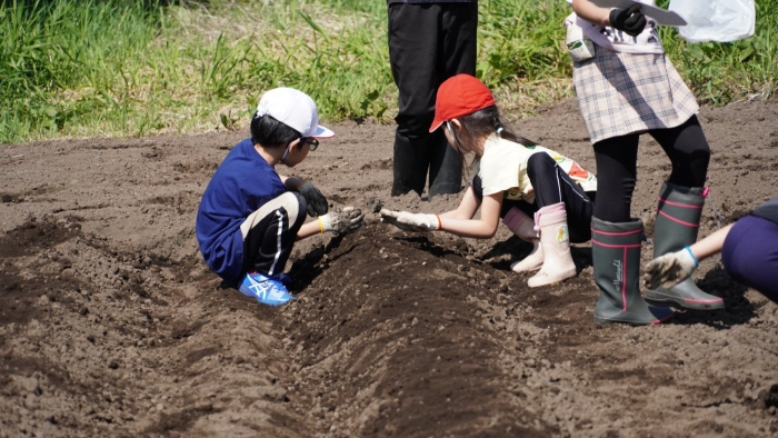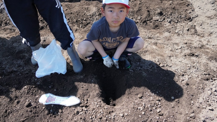 みんなで大きく実るように願いを込めながら、学校農園にジャガイモを植えました。