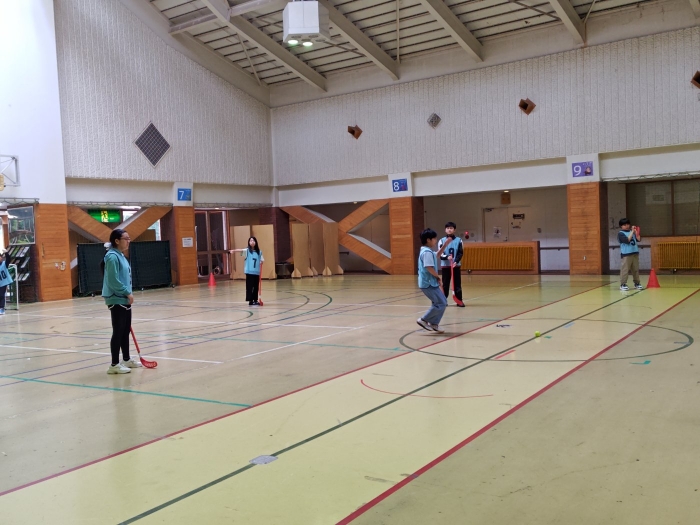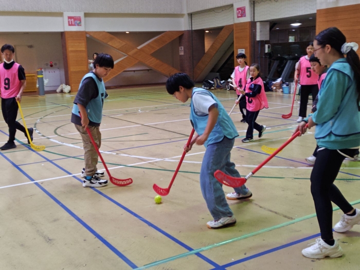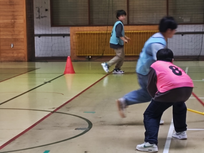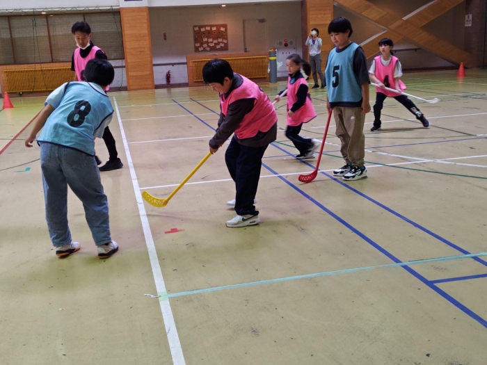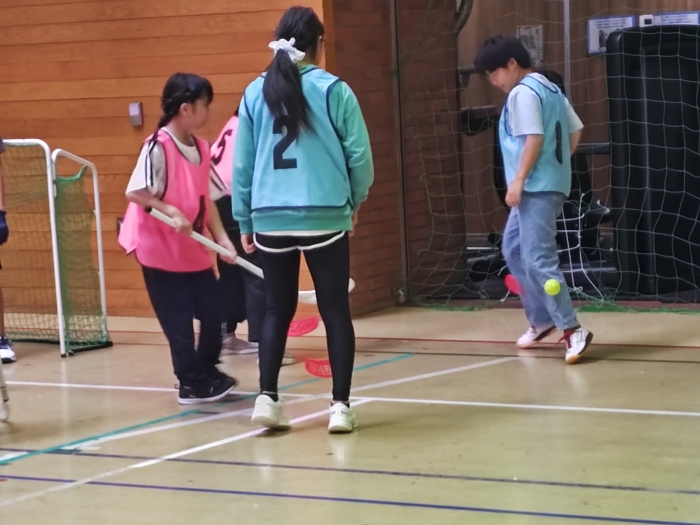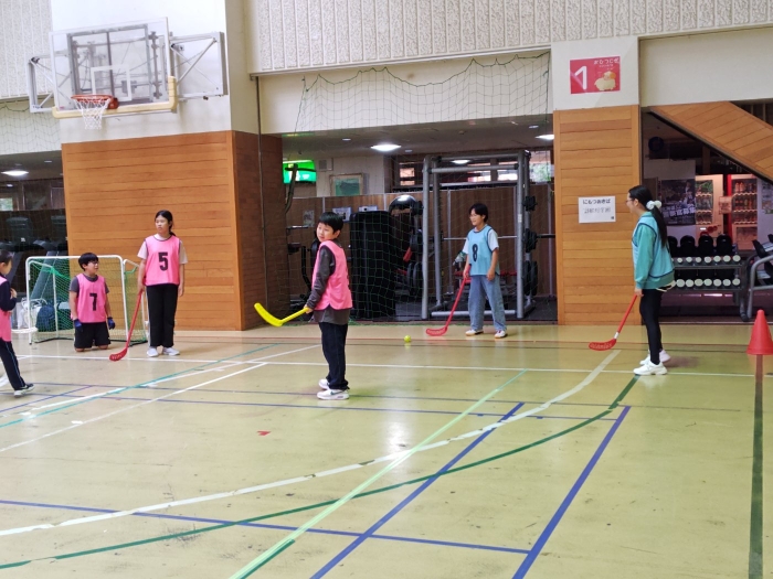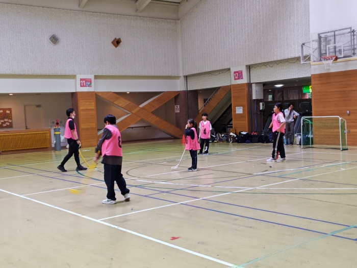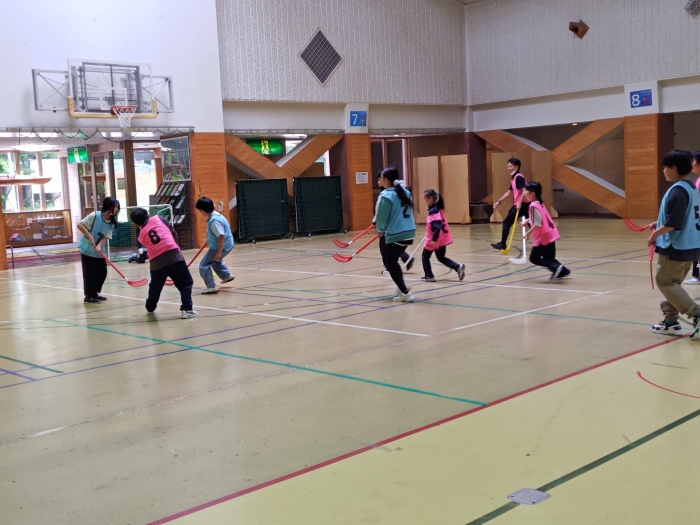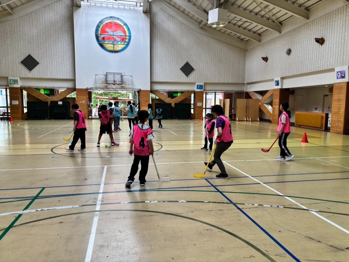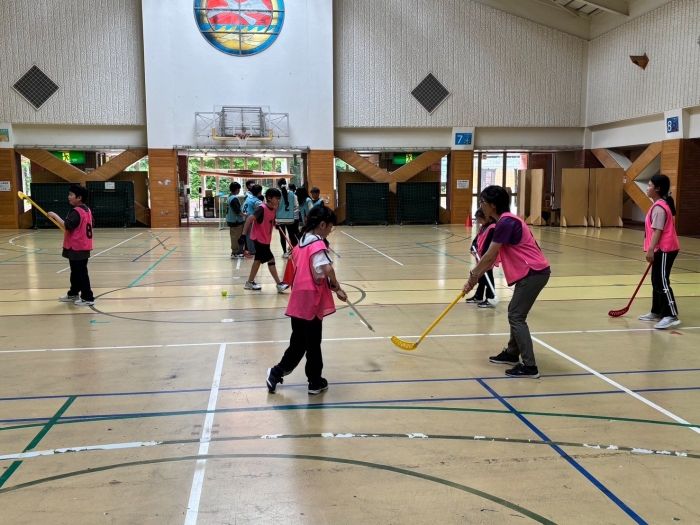 出会いの集いの後、さっそくフロアボール(ホッケーの室内版です)を始めました。