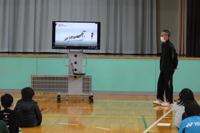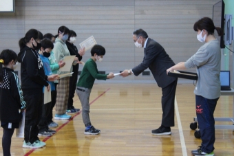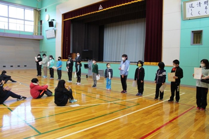 全校朝会 2022年02月02日(水) 2月の全校朝会(2/1)で、冬休み作品展の表彰が行われました。今回は「けっさく賞」が6名、「親子けっさく賞」が7名でした。アイディア作品や親子での協力作品等、力作揃いでした。 後半は、2月朝会の担当職員より、50年後の天気予報をもとに、今自分たちができる節電や節水などの環境対策についての話がありました。