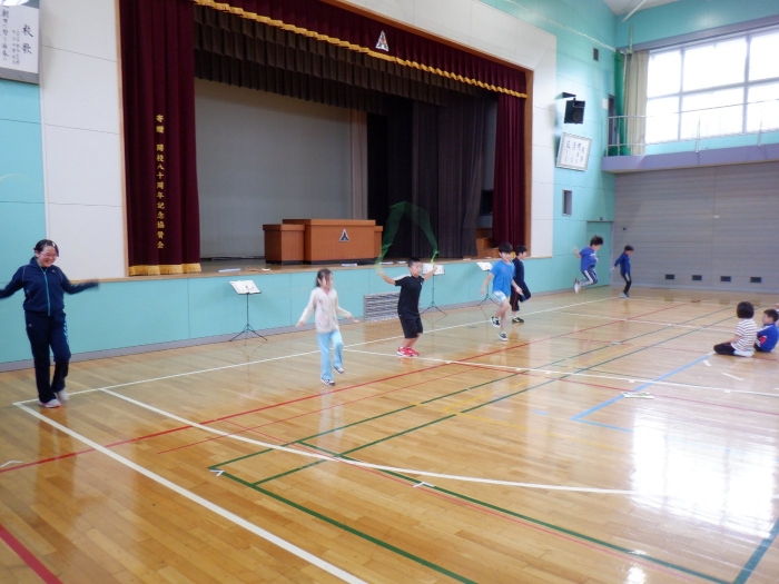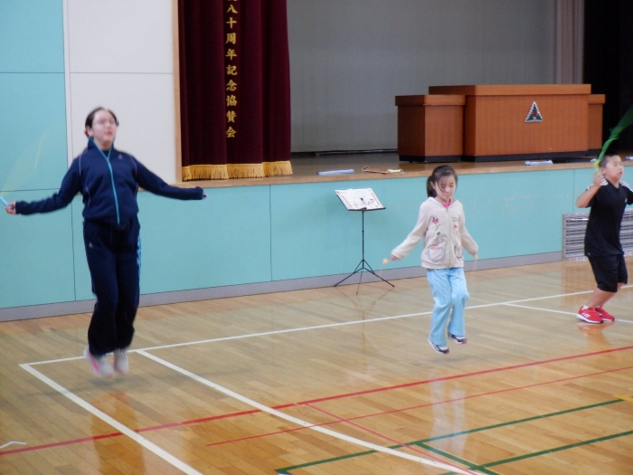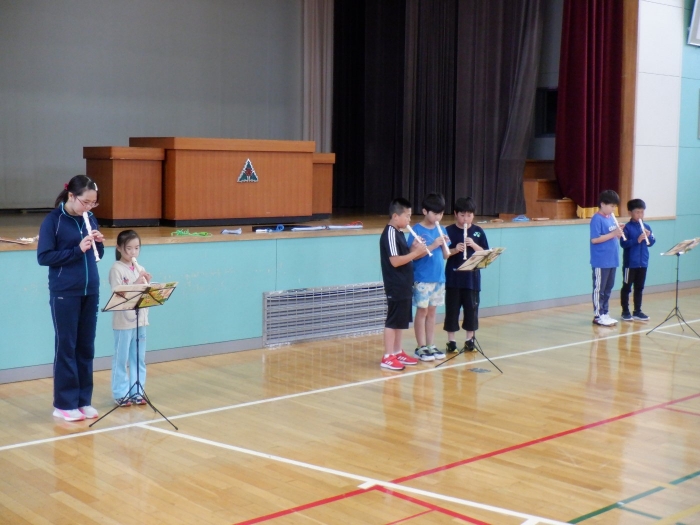 全校朝会の学習発表(中学年) 2023年06月27日(火) 今朝の全校朝会では、3・4年生の学習発表がありました。 音楽の時間に学習した「アチャ パチャ ノチャ」を リコーダーで演奏しました。 次に縄跳びの発表です。 片足とび、あやとび、二重とび 等々 自分たちが得意な跳び方を披露してくれましたよ。