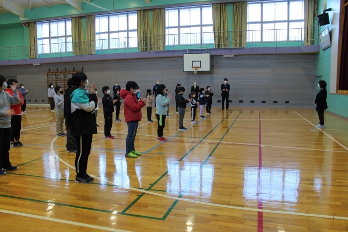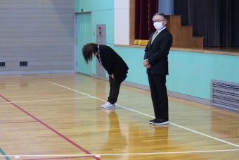 1/31(月)臨時の全校朝会を開き、1月末で退職される学校の消毒をしてくれていたスクールサポーターさんの離任式を行いました。令和2年9月から本校で勤務していただき、これまで毎日、感染症対策として校舎内の消毒作業を行っていただきました。コロナ状況下、安心して学校生活を送ることできました。