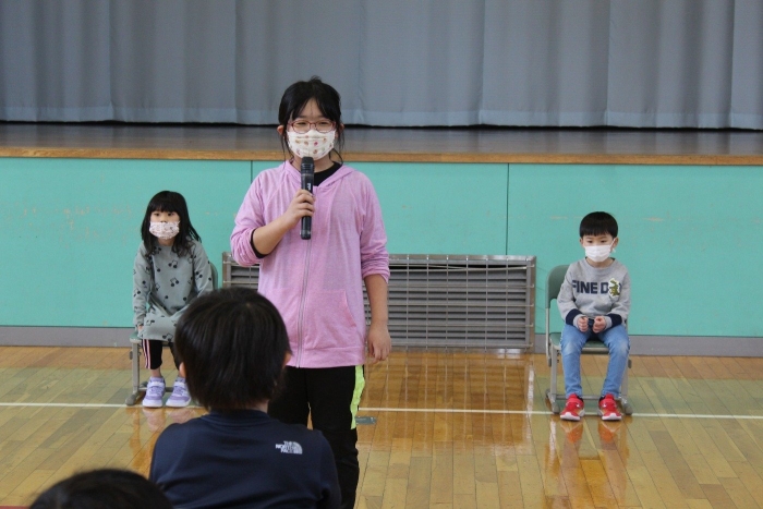 1年生を迎える会 2022年05月06日(金) 行事 4校時目に、1年生を迎える会を行いました。 企画・運営・進行は5・6年生8名です。 1年生の2名は、緊張した面持ちで入場しましたが、5年生の学校クイズが始まったとたん満面の笑みでゲームに参加していました。 6年生の企画は、「宝探し」でした。 校内に隠されたメダルをチームごとに探すゲームです。 あっという間にメダルを見つけたチームも、なかなか見つからないチームも、ヒントを頼りに楽しそうにしていました。 1年生のかわいい姿と5・6年生の頼りになる姿が見られた1時間でした。