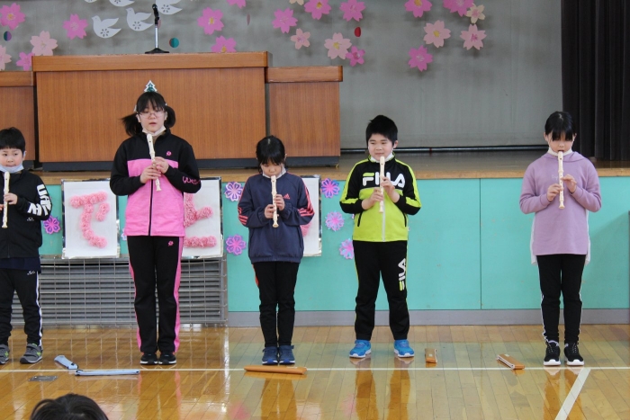 3月14日(火)全校集会 2023年03月21日(火) 行事 3月14日の全校集会は、中学年による学習発表会でした。 音楽の時間に練習した「オーラリー」と「茶色の小瓶」をリコーダーで演奏しました。 息の合った演奏で、日ごろの学習の成果を伝える素敵な発表会でした。